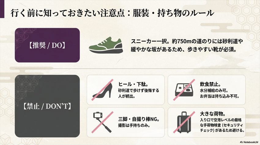 • 靴はスニーカー一択 ― 砂利道や緩やかな坂があるため、ヒールや革靴は不向き