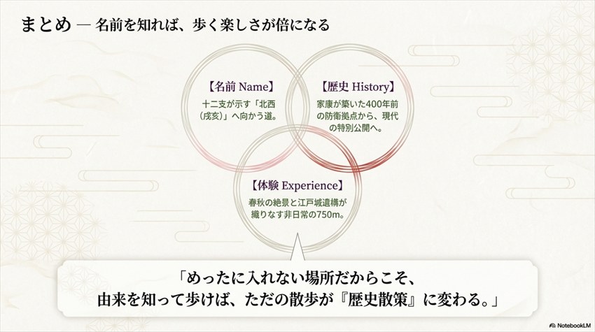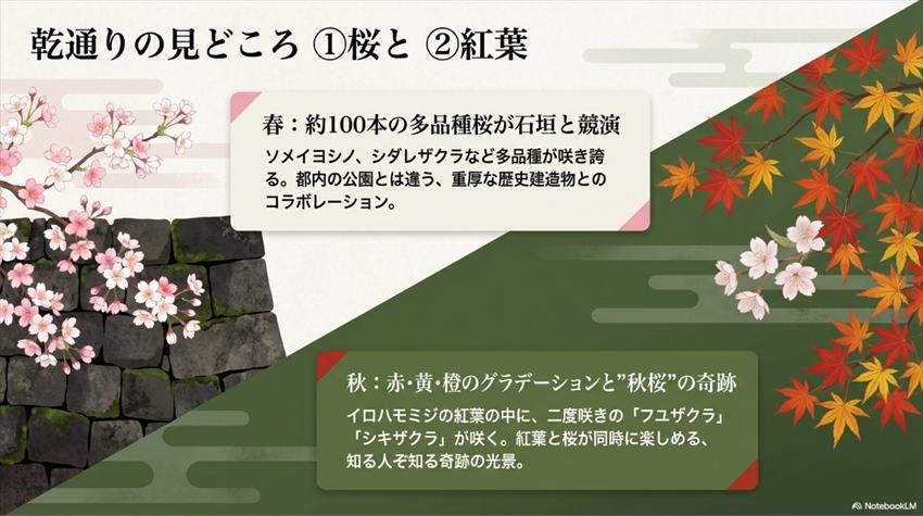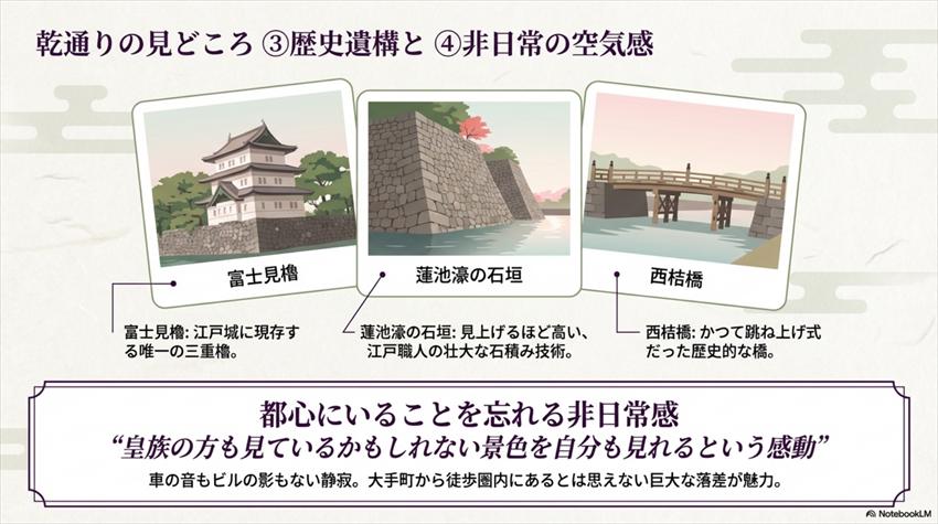 桜と紅葉ばかりが注目されがちですが、歴史好きにとっての本丸(まさに文字どおり)は江戸城の遺構です。乾通りの散策中に見られる主な歴史スポットはこちら。