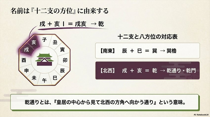 北西は「戌(いぬ)」と「亥(い)」の間に位置することから「戌亥(いぬい)」と呼ばれ、これに「乾」の漢字が当てられました。つまり「乾通り」とは、「北西の方角へ向かう通り」という意味そのものなんですね。