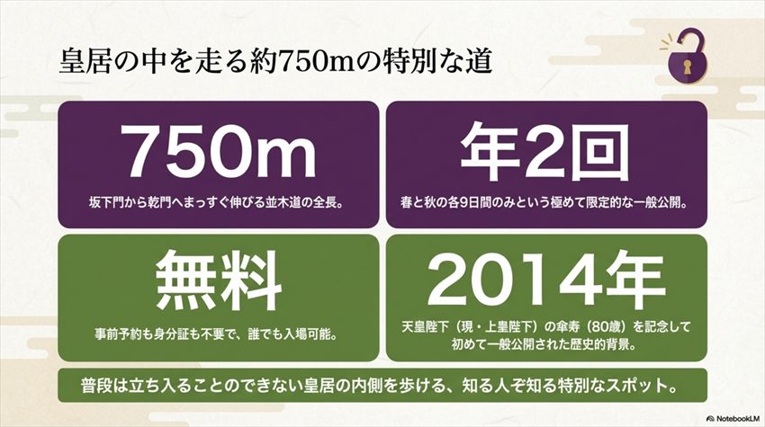 それまで乾通りは、皇居内の「御通り」として皇族や関係者のみが利用する道であり、一般人が歩くことは想像すらできない場所だったんです。傘寿記念の公開が大きな反響を呼んだことから、翌年以降も春と秋の年2回、定例的に公開されるようになりました。