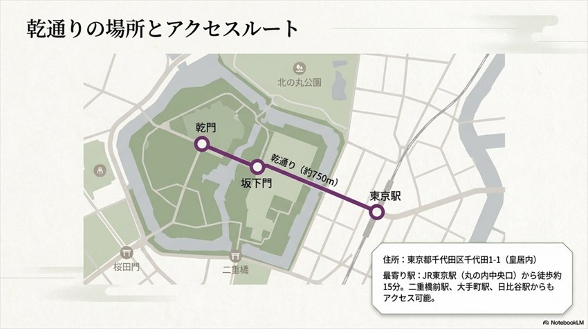 [※ここに皇居全体図と乾通りの位置を示す地図を挿入]