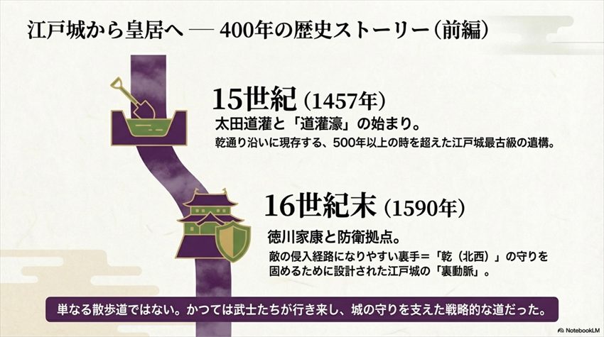 • 1457年に太田道灌が江戸城を築城、徳川家康が北西の防衛ラインとして整備した400年超の歴史