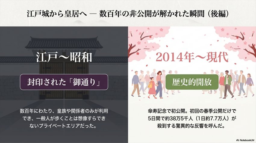 結果は、宮内庁の想定をはるかに超えるものでした。初回の春季公開だけで38万人超が来場。数百年間、誰も歩けなかった道に、これほど多くの人が押し寄せたのです。