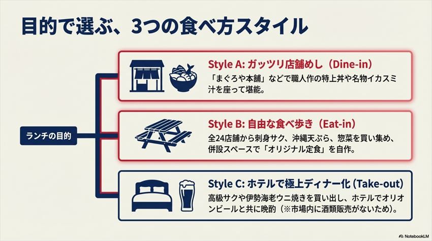 - ③ テイクアウト:惣菜・弁当・刺身パックを買って、ホテルや港のベンチで自由に食べるスタイル