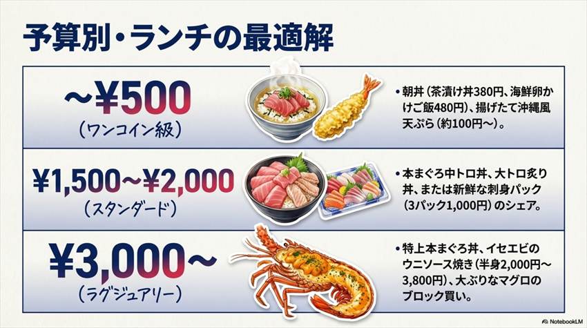 ワンコイン500円から2,000円台まで、幅広い予算に対応できる。沖縄近海の生マグロという、本土では味わえない鮮度が最大の武器。ただし「11時前に着く」「現金を用意する」「午後は品薄覚悟」の3点だけは外せない。