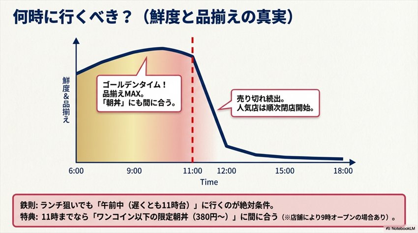 この気持ち、わかるんですよ。市場って普通の飲食店と違って、午後に行くともう「閉まりかけの商店街」みたいな雰囲気になることがある。知らずに行くと「あれ? こんなもん?」と拍子抜けする。この記事を読んでから行く人は、同じ失敗は絶対にしないはずです。