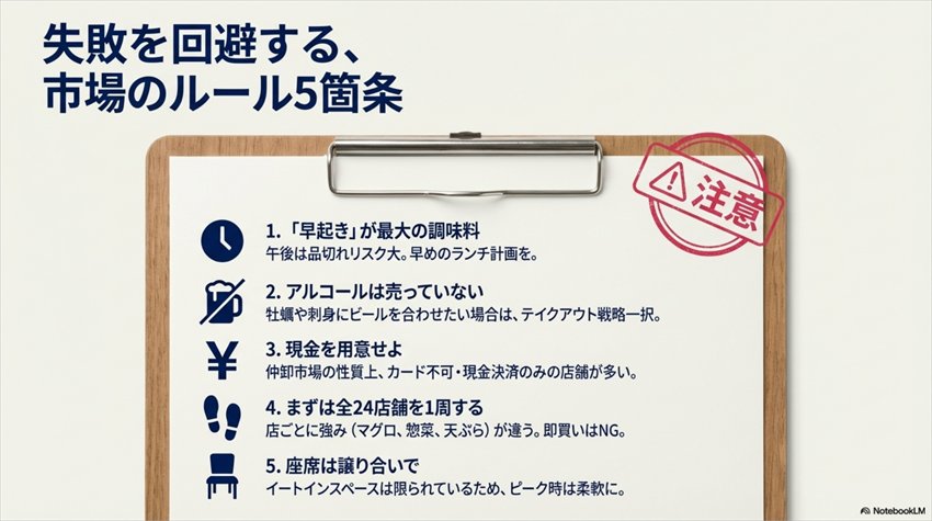 - 鉄則③ 現金を用意し、市場のルールを知ってから行く:醤油有料・席は共用・飲み物はセルフ。事前に知っていれば何も困らない