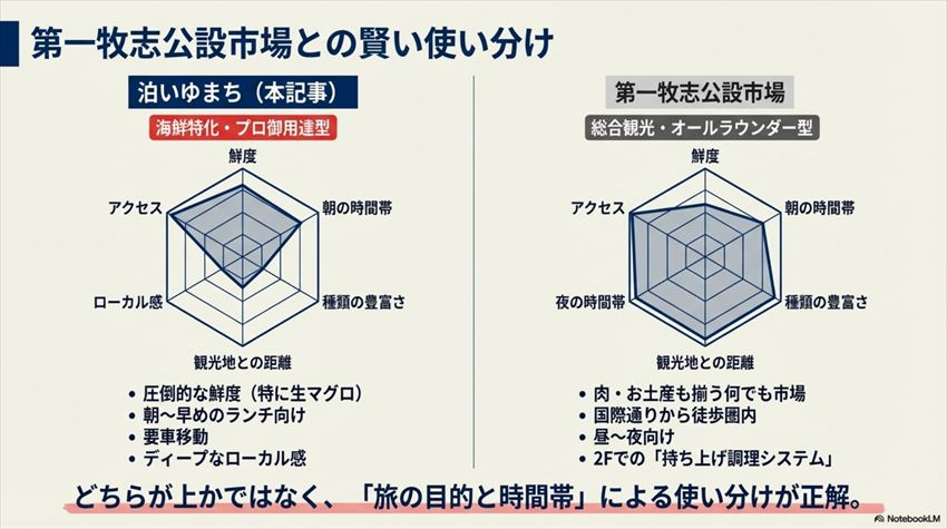 どっちが上じゃなくて、目的が違うんです。時間があるなら、正直両方行ってほしい。午前中に泊いゆまちでランチを食べて、午後は国際通り散策ついでに牧志公設市場を見学する。これが一番贅沢な使い方ですね。