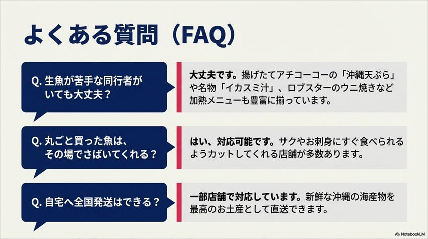 - 鉄則② 食堂の丼だけに頼らない:刺身・天ぷら・握りを買い集める”市場めしスタイル”こそ泊いゆまちの醍醐味