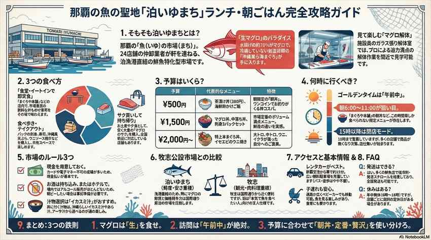 この記事では、実際に複数回通った体験をもとに、泊いゆまちランチの「3つの食べ方」「ベストな到着時間」「予算別プラン」「失敗しない市場のルール」を全部まとめました。牧志公設市場との比較も正直にやります。