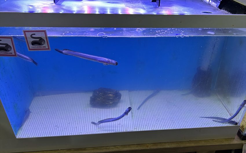 細長い体が水槽の中をゆらゆら漂っていて、正面から見ると歯がむき出しになった口元がはっきり見える。目が退化して皮膚の下に埋もれているので、顔の造形が本当にエイリアン。近づくと、ガラス越しに小さな歯の一本一本まで確認できるんです。この距離感は大きい水族館ではまず無理ですよ。