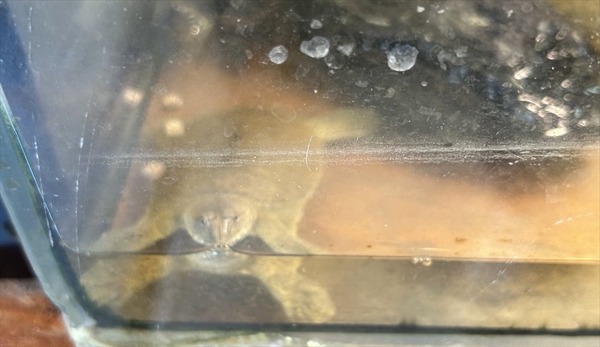 まず目の位置。頭頂部にぴょこんと飛び出している2つの目が、近くで見ると想像以上に独特。そして口が大きい。底面を活発にはい回る姿は、テレビで見るよりずっと生々しくて、生き物としての存在感がありました。